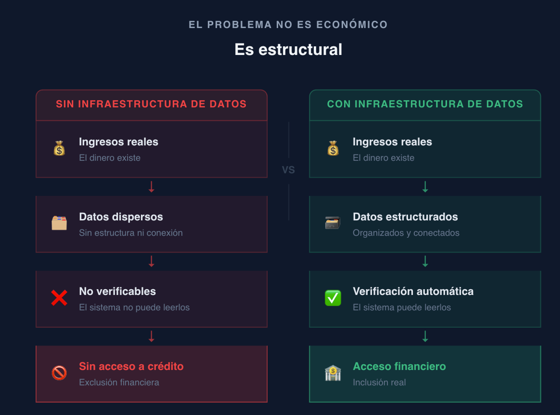 Para una institución financiera, esta fragmentación se traduce en un problema concreto porque no pueden verificar los ingresos de forma confiable. Esto las obliga a ser más conservadoras en sus modelos de riesgo y termina generando dos efectos que se refuerzan entre sí, más personas quedan excluidas del crédito y el crédito se vuelve más caro para quienes sí logran acceder a él.